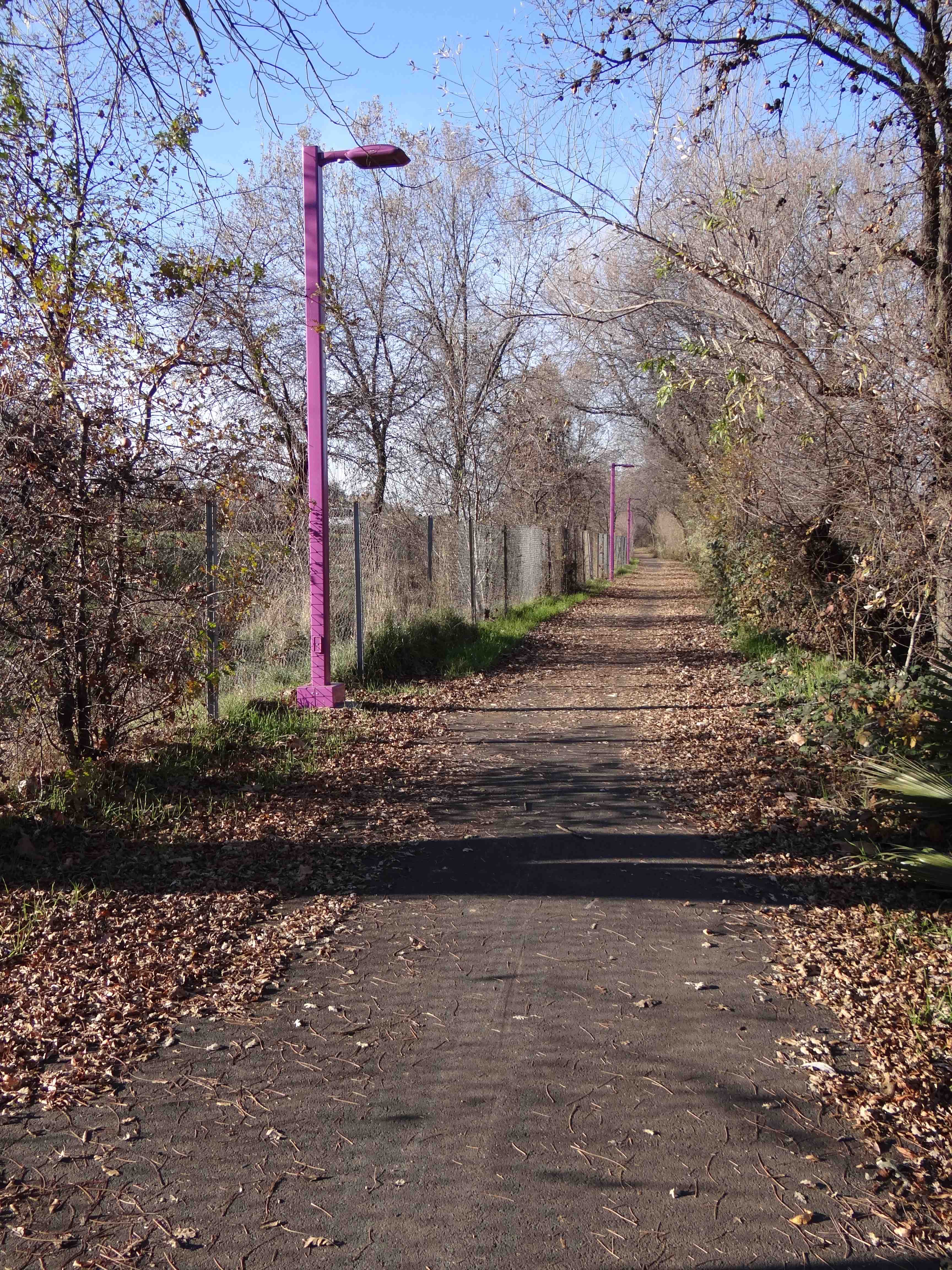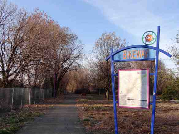 The Chico 99 bikeway, which parallells the highway, runs through the Ponds. The paved path connects to the Humboldt Road bike path with a bridge across Little Chico Creek. This sign is behind Lowe’s, near the Chico Mall. Photo by Jon Aull.