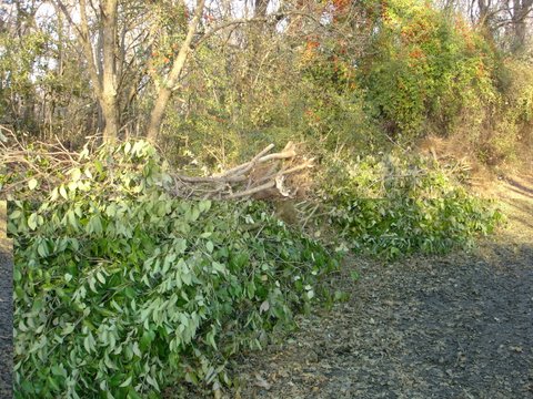 The removal of so many mature, seed producing privet and olive trees will reduce the future infestation of this site and nearby open space and residential areas. As the dense vegetation has been thinned out, native plants such as California bay, spice bush, blue elderberry, manroot, and pipevine will have a much better chance of survival with the reduced competition for water and light. Neighbors who walk in the area say they feel safer walking along the dirt road now that there is more clearance and visibility on the sides. The work also reduced the number of locations for hidden homeless camp sites.